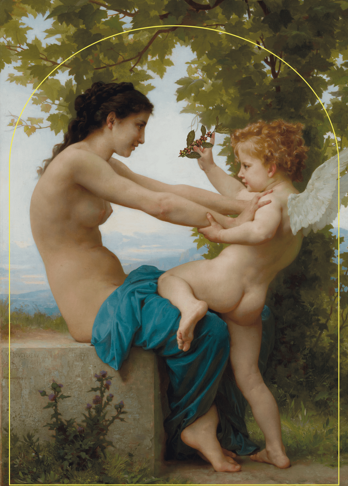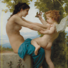 Die junge, nackte Frau ist der Versuchung nahe, sich vor dem Pfeil von Amor zu verteidigen. Doch sie lächelt und wehrt sich nicht überzeugend gegen den schelmischen kleinen Gott.