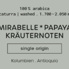 Mittelkräftige Röstung, besonders gut verträglich. Angenehm aromatisch nach weichen Kräuternoten, abgerundet durch die milde Süße der Mirabelle. Saftige Papaya im Nachgeschmack.